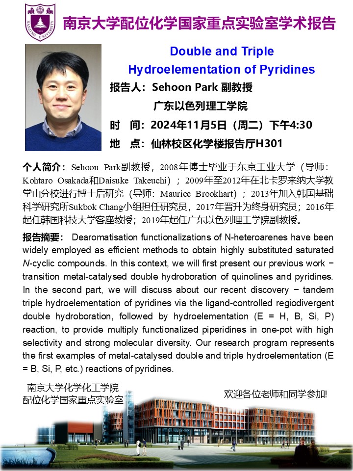 11月5日学术报告-Sehoon Park 副教授: Double and Triple Hydroelementation of Pyridines