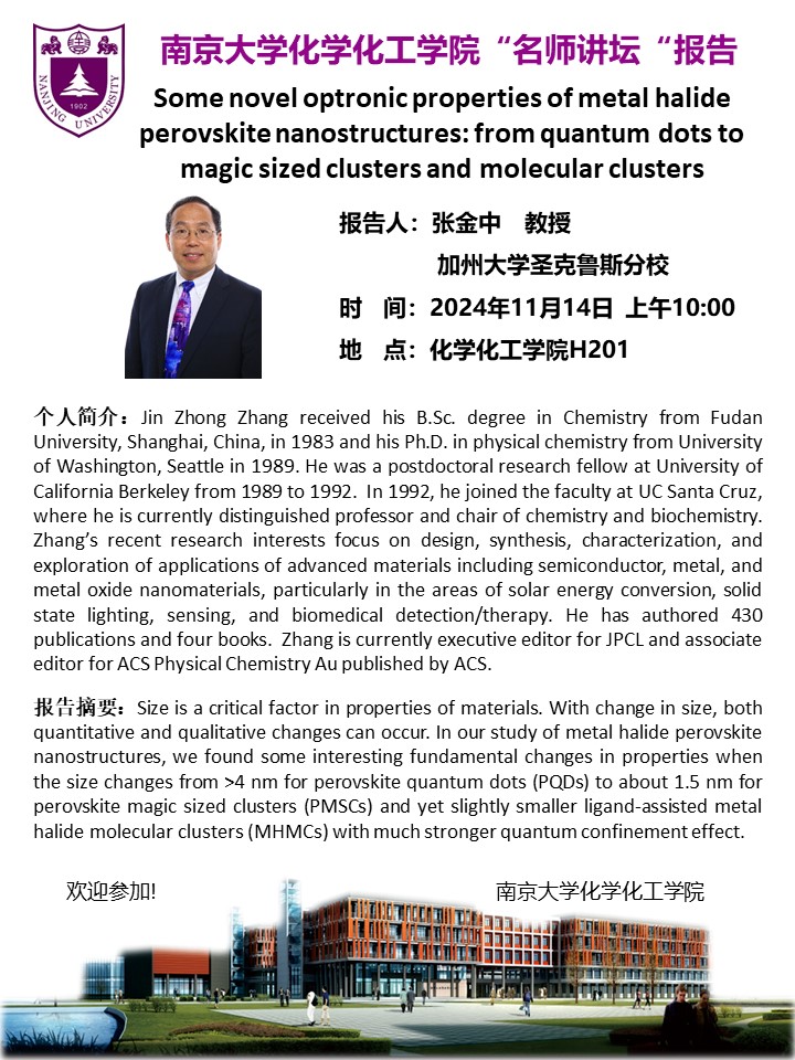 11月14日名师讲坛-张金中教授:Some novel optronic properties of metal halide perovskite nanostructures: from quantum dots to magic sized clusters and molecular clusters
