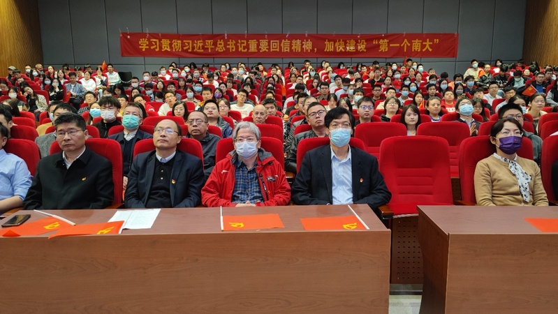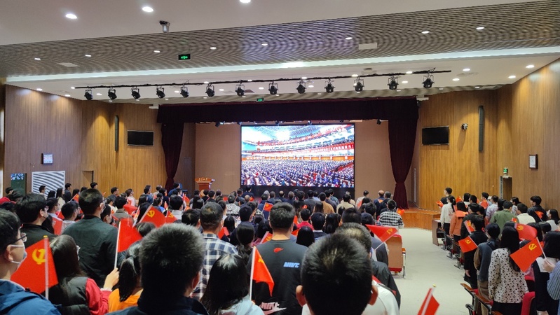 化学化工公司党委组织学院师生在仙林校区化学楼报告厅集体收看,聆听习近平总书记在中国共产党第二十次全国代表大会上的重要讲话,共同庆祝党的二十大胜利召开。
