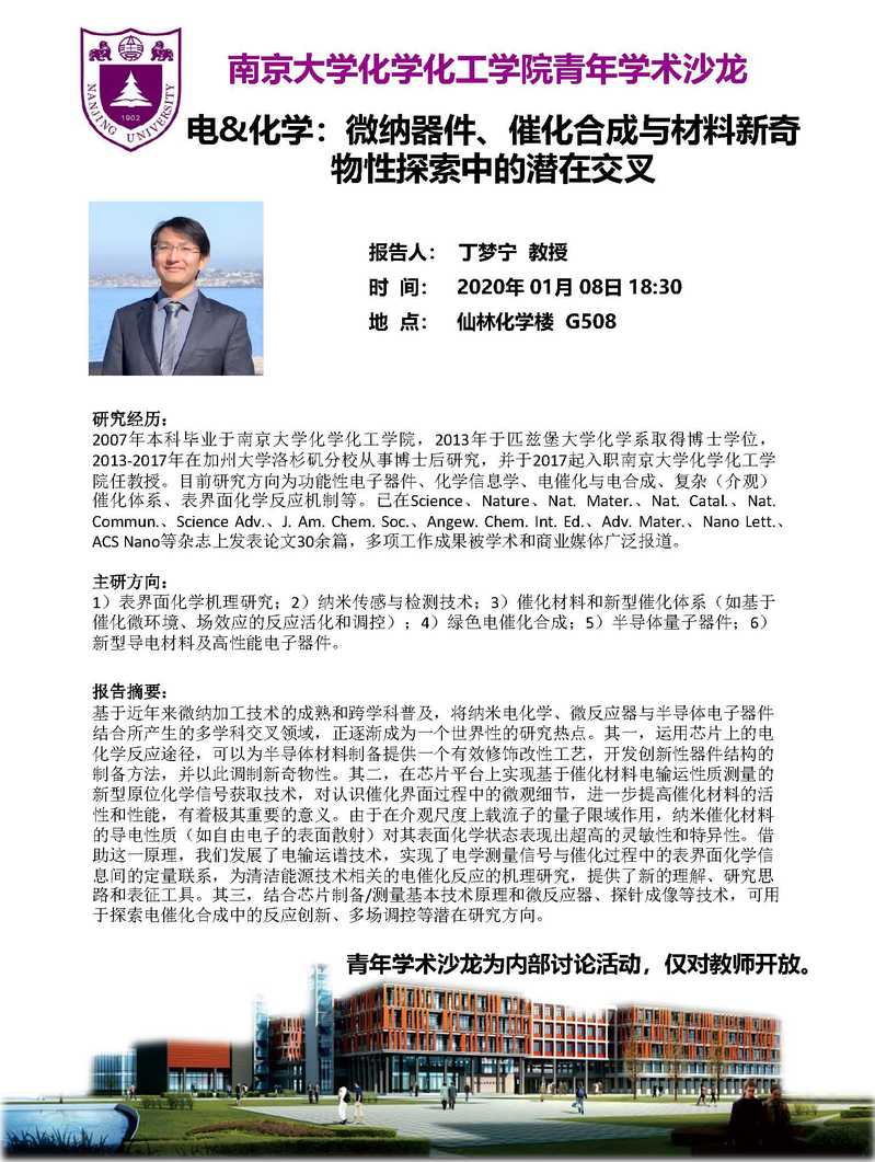2020年01月08日 | 丁梦宁 | 电&化学:微纳器件、催化合成与材料新奇物性探索中的潜在交叉 | 18:30 | G508 |