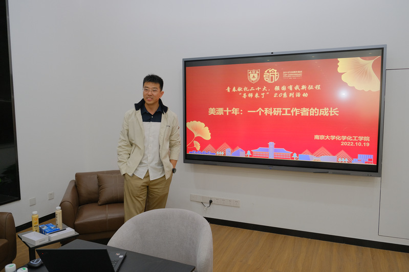 2022年10月19日,化学化工学院在仙林校区化学楼员工之家举办了首轮“青春献礼二十大,强国有我新征程——导师来了2.0”系列活动,本次活动邀请了公司2011届本科员工、西湖大学理学院孙磊博士,为同学们作主题为“美漂十年:一个科研工作者的成长”的讲座。此次活动由化学化工学院员工会承办,公司党委副书记李兴华、学工办部分教师和30余名本硕博同学参加了此次活动。