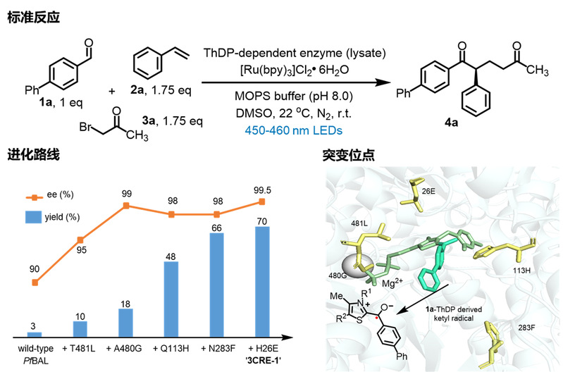 团队选取4-苯基基苯甲醛(1a),苯乙烯(2a)和溴丙酮(3a)作为模板底物,探索了[Ru(bpy)3]Cl2•6H2O和ThDP依赖酶的催化体系。随后通过分子动力学模拟和半理性的迭代位点特异性突变策略对酶进化改造,团队发现T481L,A480G位点突变对反应的对映选择性有一定提升,Q113H,N283F位点对反应的收率有显著提升,最终通过五轮突变获取了最优的突变体(图2)。