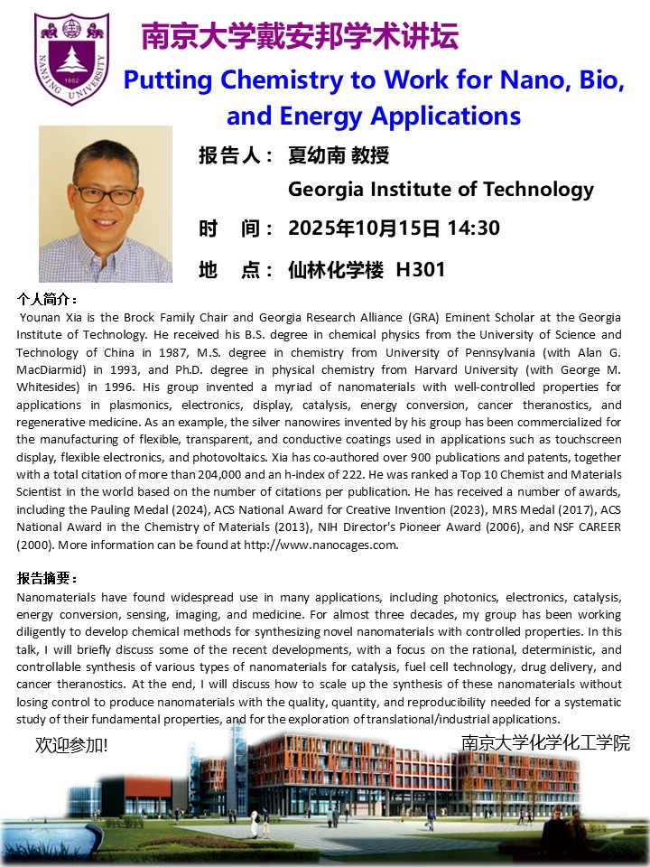 10月15日戴安邦学术讲坛-夏幼南教授:Putting Chemistry to Work for Nano, Bio, and Energy Applications