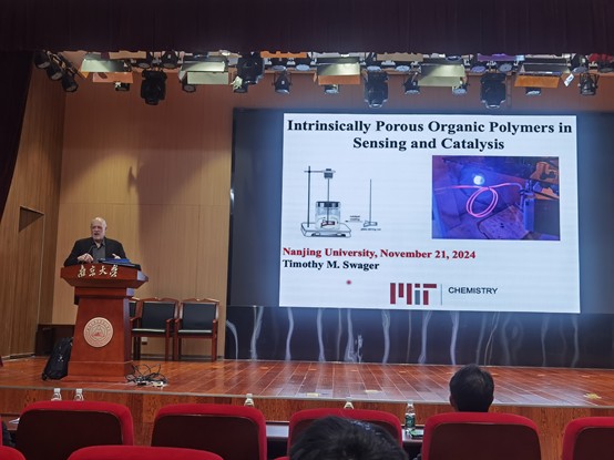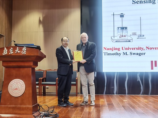 2024年11月21日下午,美国国家科学院院士、美国国家艺术与科学院院士、麻省理工学院Timothy M. Swager教授应邀作为betway西汉姆联 “戴安邦学术讲坛”嘉宾,为学院师生作了题为“Intrinsically Porous Organic Polymers in Sensing and Catalysis”的精彩报告。本次报告由化学化工学院经理黎书华教授主持。黎书华经理介绍了Timothy M. Swager教授的简历和在科学研究中卓越成就,并向Timothy M. Swager教授颁发了betway西汉姆联“戴安邦学术讲坛”纪念铭牌。公司多个学科的教师及员工参加了报告会。