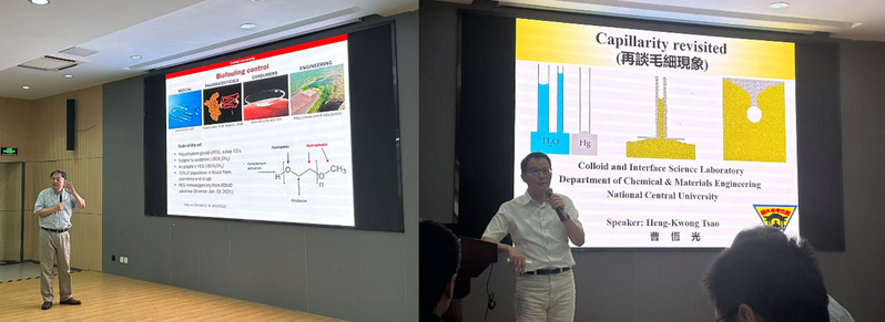 接下来的学术讲座环节,多位在界面科学领域建树颇丰的学者,为在场师生带来了内容丰富、引人入胜的学术报告:江绍毅教授(下图左)以“两性离子界面:从基本原理到应用”为题,深入浅出地讲解了其课题组在两性离子材料领域的开创性工作。报告系统阐述了分子设计、界面构筑的基本原理,并生动展示了两性离子材料在生物医学设备与药物递送等领域的广阔应用前景。他的讲解引起了与会者的极大兴趣。台湾中央大学工学院主任、《Langmuir》期刊Senior Editor曹恆光教授(下图右),以其独特的视角带来了题为“再谈毛细现象”的报告。他从经典的物理现象出发,结合现代界面科学的理论与实验手段,对毛细现象进行了全新的解读,探讨了其在微流控、能源、先进材料制造等新兴领域的深刻影响,其独到的见解引发了与会者的深入思考。