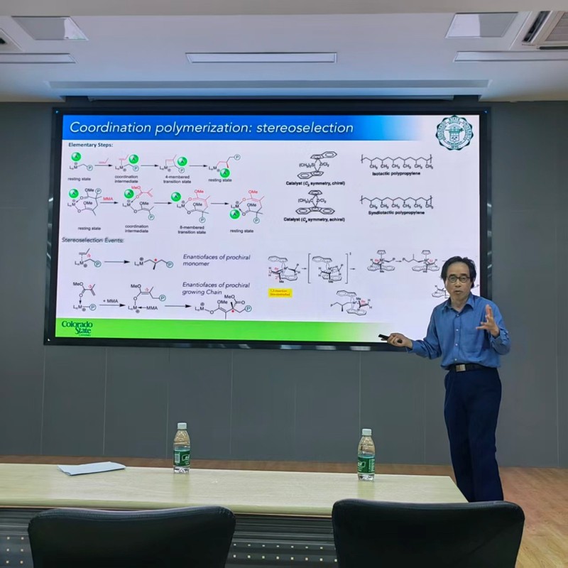Eugene教授重点阐述了单体选择原则、立体选择性聚合机理和立体异构聚合物的构效关系,例如,从热力学和动力学角度出发筛选出开环聚合的内酯单体;设计出具有立体选择性控制的催化剂,从而对聚合物的立体结构和理化性能进行精准调控,实现了从单体到聚合物的闭环化学回收。他的研究团队在可回收高分子材料领域取得了一系列创新性研究成果,为可持续高分子材料设计提供了闭环循环新示范。