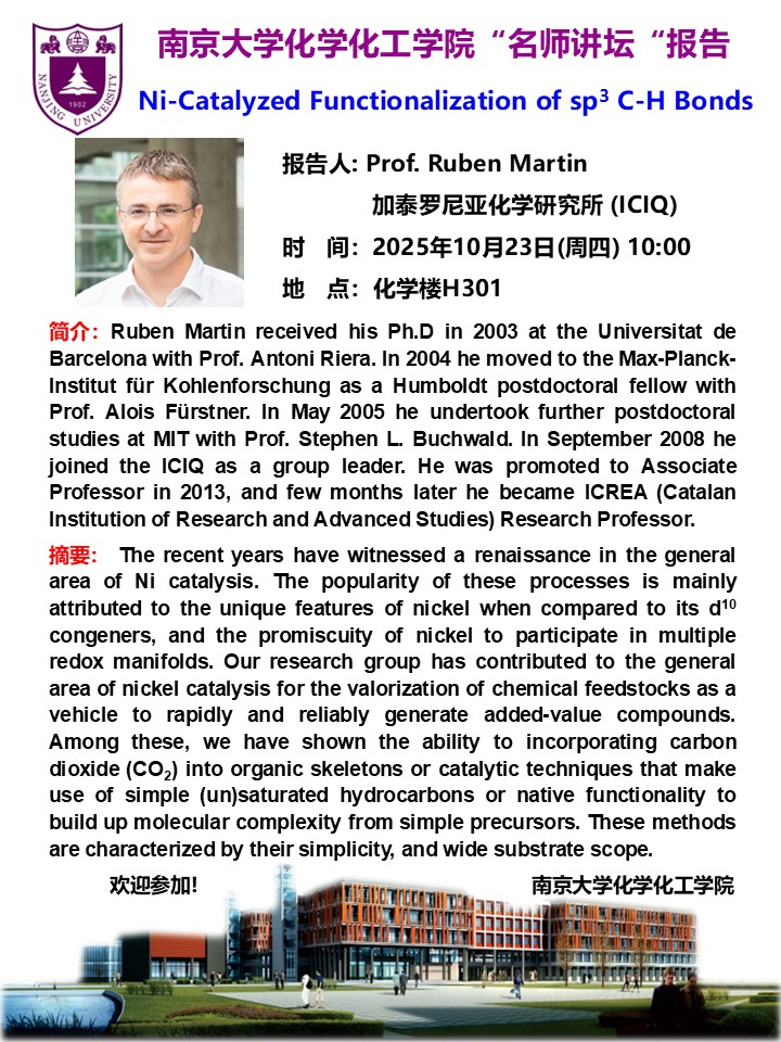 10月23日名师讲坛-Prof. Ruben Martin: Ni-Catalyzed Functionalization of sp3 C-H Bonds