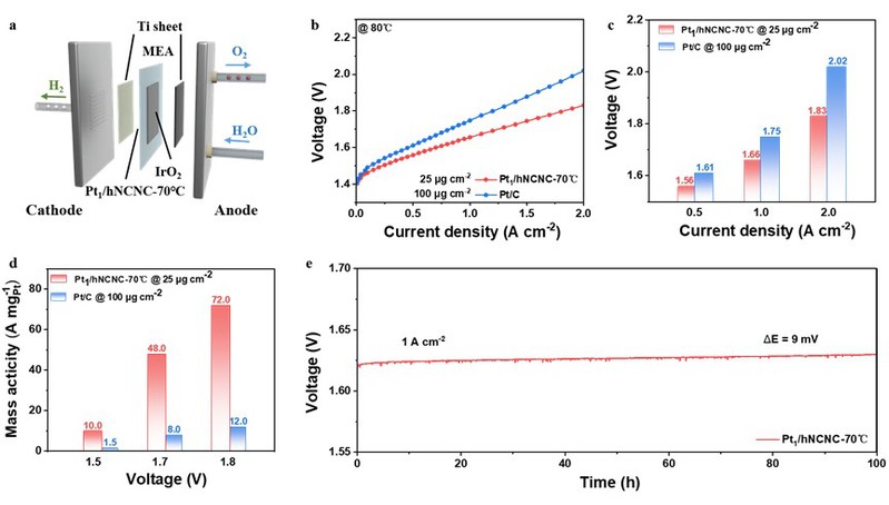 图4. PEMWE性能。(a)装置原理图。(b)极化曲线。(c)不同电流密度下的电池电压。(d)质量活性。(e) 1.0 A cm-2时计时电位曲线。