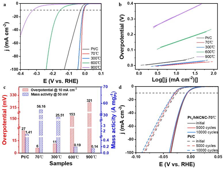 图 2.Pt/hNCNC系列样品HER电化学测试性能。(a) Pt/hNCNC-70℃、-300℃、-600℃、-900℃与20 wt% Pt/C商用催化剂的极化曲线。(b) Tafel斜率曲线。(c) Pt1/hNCNC-70℃、20 wt% Pt/C在0,5000和10000次CV扫描后的LSV曲线。(d) 过电位与50 mV时的质量活性。