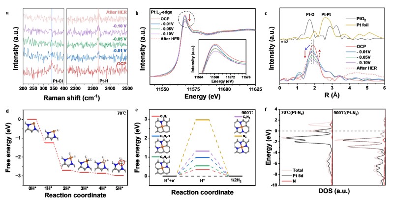 图3.Pt1/hNCNC-70℃中活性位点的测定及HER机理的DFT计算。(a-c) Pt1/hNCNC-70℃电催化HER: Raman谱(a), Pt L3边缘XANES谱(b)和FT-EXAFS谱(c)。(d, e) Pt/hNCNC-70℃(d)和-900℃e)的HER自由能图。(f) Pt/hNCNC-70℃和-900℃的分波态密度图(PDOS)。