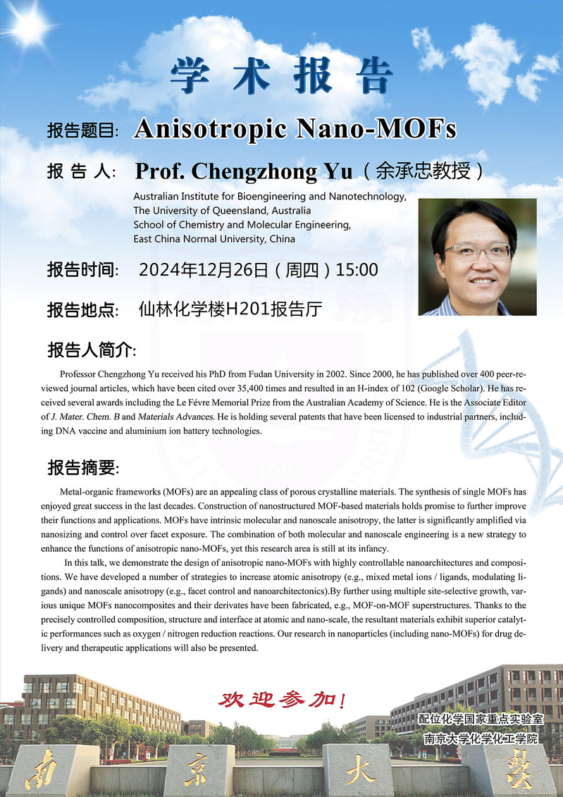12月26日学术报告-余承忠教授:Anisotropic Nano-MOFs