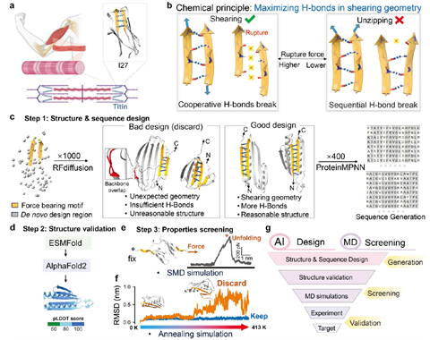 自然界中的肌联蛋白等凭借其β-折叠片内密集的氢键网络,展现出卓越的机械性能。受此启发,郑鹏教授团队基于在“AI+蛋白质设计领域的长期积累,开发出一套由AI驱动的计算设计新方法。该方法通过系统性优化与延伸β-折叠链结构,最大化主链氢键网络,从而实现了对蛋白质力学性能的按需定制。基于此策略,团队成功从头设计出名为“SuperMyo”的超稳定蛋白质,其性能远超天然同类蛋白。