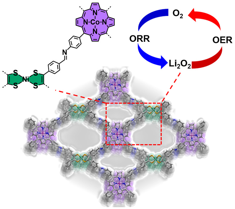 可充电非质子锂氧气电池(Li-O2)具有高的理论能量密度,因此可能应用于新一代储能技术领域。目前该类电池仍存在许多问题,如过电位大、倍率性能低和循环稳定性差等。合理设计高效稳定的氧还原反应(ORR)和氧析出反应(OER)催化剂是提高Li-O2电池性能的关键。化学化工学院左景林教授课题组基于四硫富瓦烯(TTF)与金属镍二硫烯结构和性能上的相似性,合成了基于金属镍二硫烯四苯醛配体的共价有机框架材料(COFs),并研究了其在锂金属负极材料方面的应用(J. Am. Chem. Soc. 2022, 144, 18, 8267–8277)。在此基础上,左景林教授、马晶教授与现代工程与应用科学学院何平教授等合作,在COFs材料中同时引入镍二硫烯单元和钴卟啉单元,构建出了ORR/OER双功能阴极催化剂,实现了高效的Li-O2电池性能。