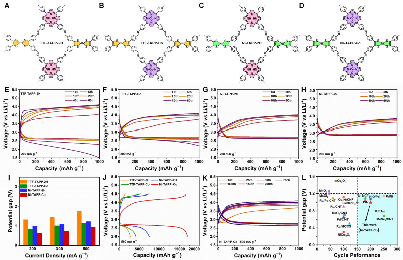 他们利用镍二硫烯四苯醛配体与钴卟啉成功合成了双金属氧化还原共价有机框架材料(Ni-TAPP-Co),并作为Li-O2电池的双功能ORR/OER催化剂。Ni-TAPP-Co具有高比表面积(116 m2 g−1)、良好的导电性(1.18 × 10−4 S m−1)以及优异的化学及电化学稳定性。在500 mA g−1高电流密度下,相比于无金属的TTF-TAPP-2H,单金属的Ni-TAPP-2H,TTF-TAPP-Co电极材料,具有双金属的Ni-TAPP-Co电极材料在Li-O2电池中表现出了良好的ORR/OER催化性能,将电池整体充放电电势差降到1.0 V,并且能够持续稳定循环200圈,其性能接近PtAu贵金属纳米催化剂。密度泛函理论(DFT)和对照实验揭示了Ni和Co位点在降低放电/充电过电位和调节Li2O2沉积中的起到了关键作用。本项工作展现了金属配合物材料在Li-O2电池中的应用,丰富了金属配合物材料在储能方面的研究。