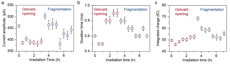 进一步,通过调控反应物银离子浓度改变纳米颗粒化学势差,调节颗粒间动态化学通讯过程,控制纳米颗粒集体的光化学反应路径。单颗粒随机碰撞电化学实验依次遍历表征溶液中的单个银纳米颗粒,发现纳米颗粒尺寸先增大后减小,表明先经历Ostwald ripening(奥斯特瓦尔德熟化),随后发生光诱导Coulomb explosion(库伦爆炸)过程。