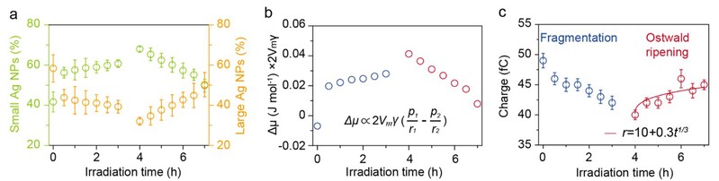 图2. (a)大粒径和小粒径银纳米颗粒群的结构转化依存关系,(b)不同辐照时间下银纳米颗粒间的化学势差变化,