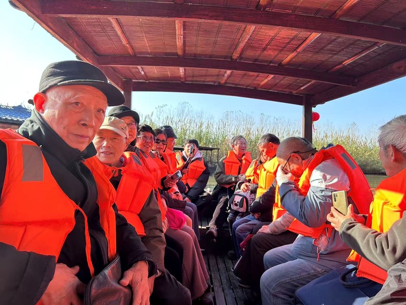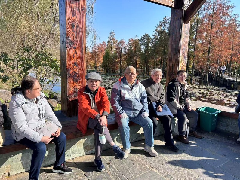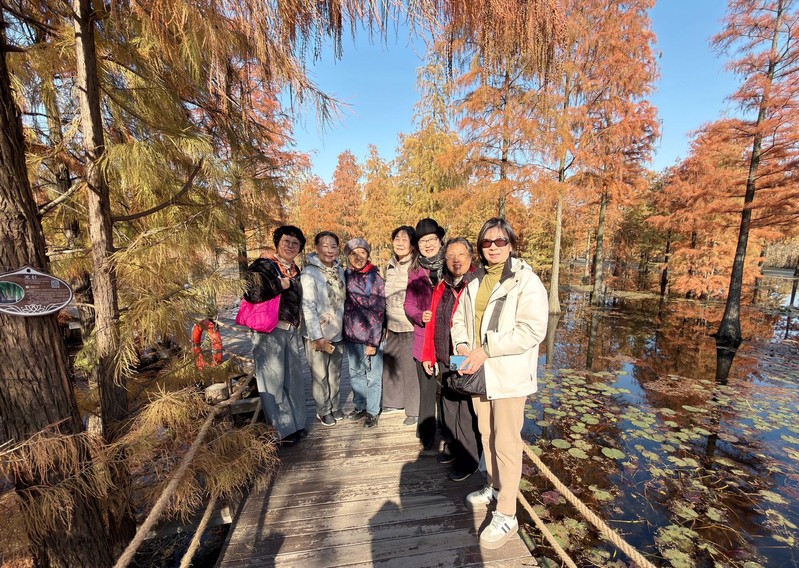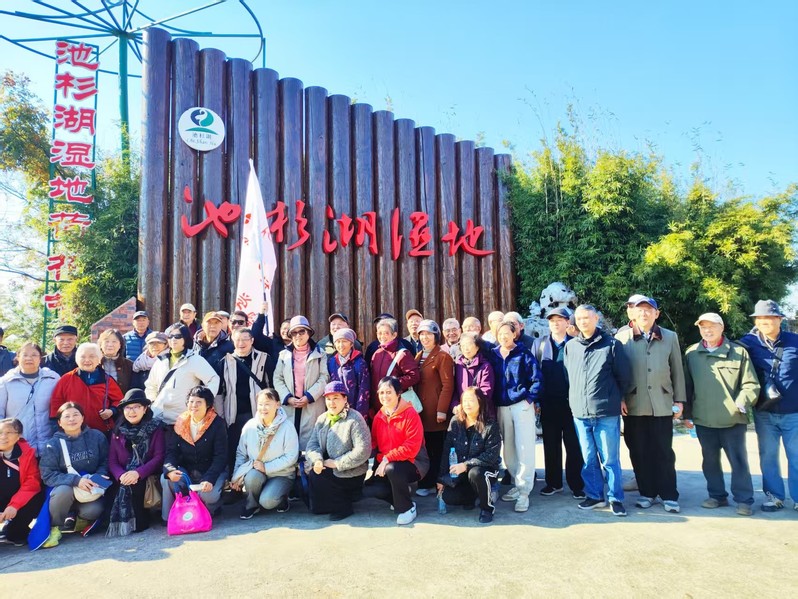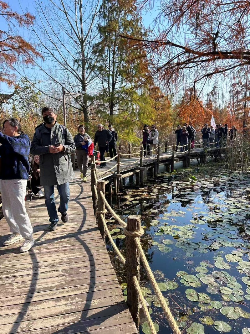 参观活动结束后,退休老师们游览了周边的池杉湖国家湿地公园。正值深秋的池杉树叶从翠绿变为浅黄、橙红、深红,层层叠叠,倒映在湖面上美不胜收。退休老师们漫步在木质栈道上,乘船深入水上森林核心区域,近距离观赏池杉和栖息的鸟儿,解除了一天的疲劳,体会到了大自然的治愈率和生命的鲜活感,生活是那么美好。