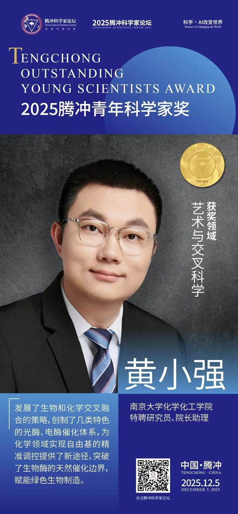 2025年12月5日,首届“腾冲青年科学家奖”颁奖典礼在腾冲举行,黄小强研究员作为艺术与交叉领域代表入选!