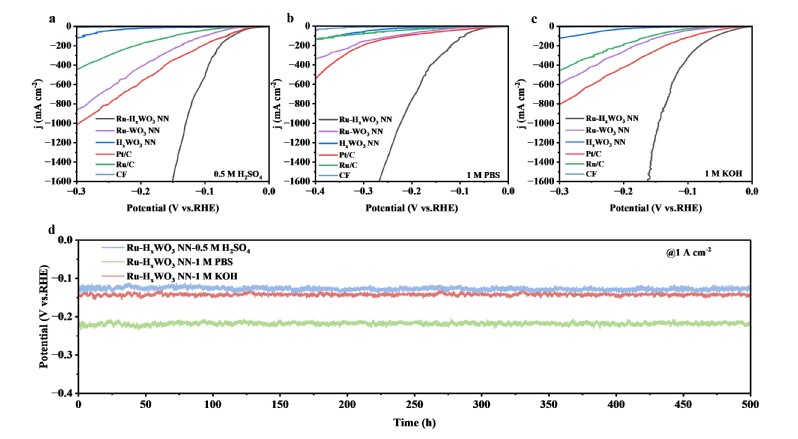 图3. Ru-HxWO3 NN、Ru-WO3 NN和HxWO3 NN在a) 0.5 M H2SO4、b) 1 M PBS和c) 1 M KOH中HER极化曲线。d) 在电流密度为 1 A cm-2的条件下,Ru-HxWO3 NN在500小时内的循环伏安曲线。