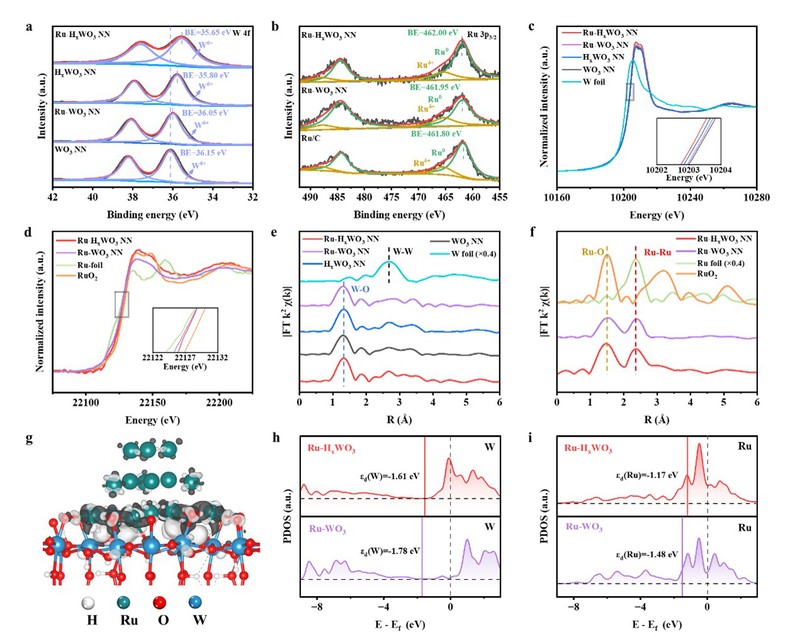 e) W和f) Ru对应的R空间FT-EXAFS光谱,g) 电荷密度差图像,黑色和白色区域分别代表电子离域和聚集。Ru-HxWO3和Ru-WO3中的h) W和i) Ru的d轨道PDOS图像,图中数值为d带中心位置。