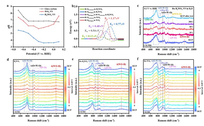 图4. Ru-HxWO3 NN和HxWO3 NN中晶格氢的动态行为。a) HxWO3 NN、WO3 NN和GC在pH为7.02的0.1 M PBS中不同电位下表面的局部pH值,b) DFT计算晶格氢迁移能垒,c) Ru-HxWO3 NN在1M PBS D2O中-0.1 V下的原位拉曼光谱,d) HxWO3、e) Ru-HxWO3、f) Ru-WO3 NN在1 M PBS溶液的原位拉曼谱。