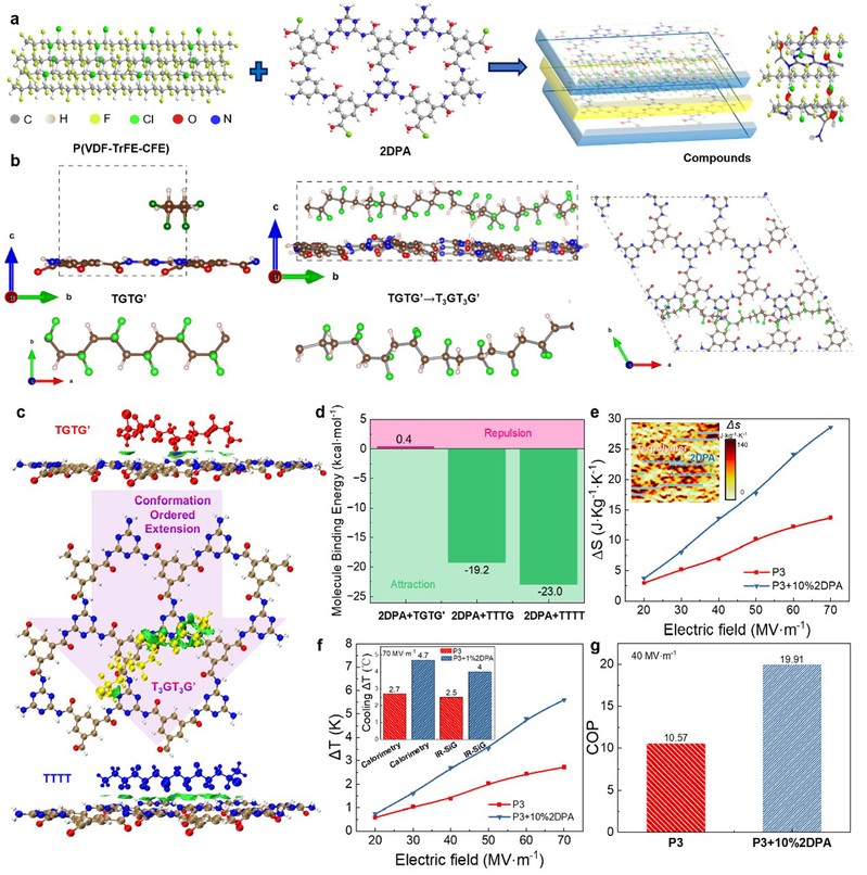 二维聚酰胺2DPA与铁电聚合物分子链的相互作用机制及电制冷效应增强。