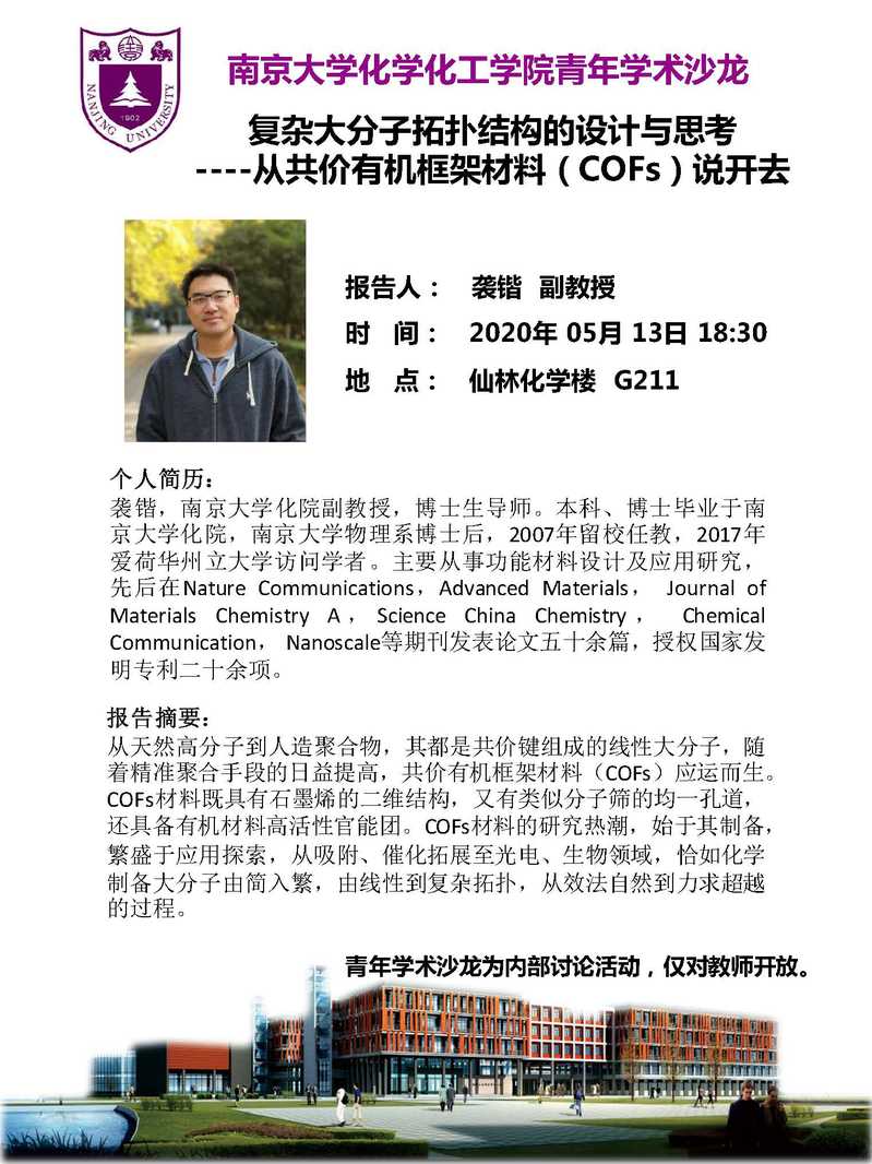 2020年5月13日 | 袭锴 | 复杂大分子拓扑结构的设计与思考 | 18:30 | G211 |