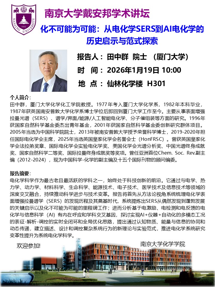 1月19日戴安邦学术讲坛-田中群院士:化不可能为可能:从电化学SERS到AI电化学的历史启示与范式探索