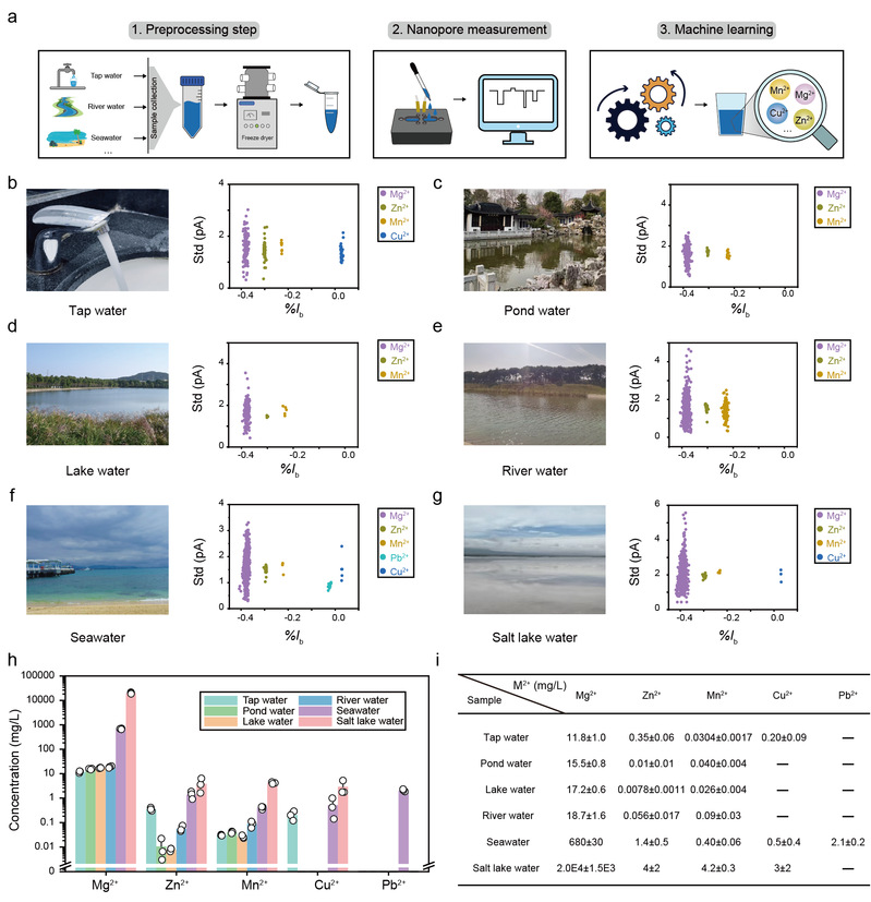 随后,研究团队将该策略应用到天然水样的M2+分析中,推动纳米孔技术的实际应用(图3)。他们分别收集来自不同地点的水样,然后借助纳米孔平台,成功识别不同天然水样中含有的M2+种类和含量。该方法可快速分析天然水样中的M2+,为可持续水资源管理、污染控制和生态保护提供工具。
