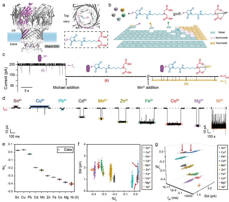 研究团队在MspA孔道识别位点处引入单个IDA适配器,构建MspA-IDA传感器(图2)。基于IDA适配器和M2+之间的配位相互作用,研究团队使用MspA-IDA纳米孔成功检测了常见的十种M2+,分别是Sn2+,Cu2+,Pb2+,Cd2+,Mn2+,Zn2+,Fe2+,Co2+,Mg2+,Ni2+。实验结果表明,在检测过程中,每种M2+均产生特异性纳米孔事件,机器学习识别准确率高达99.6%。与以往仅能检测少数M2+的纳米孔方法相比,本研究策略较为简便,更将可检测M2+成功拓展至十种,为迄今该领域报道中数量最多。