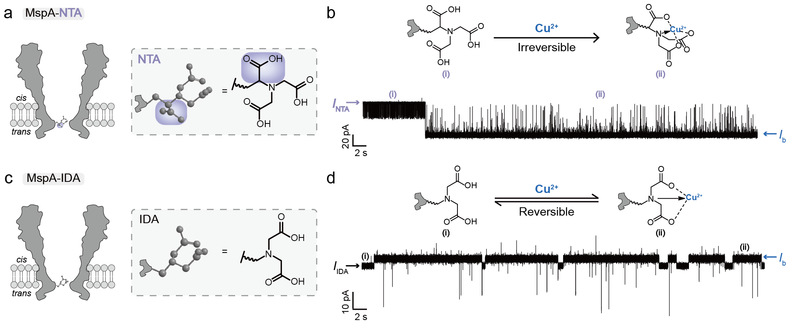 近日,公司黄硕教授课题组基于异质耻垢分枝杆菌膜蛋白A(MspA)孔道,实现了多种常见二价金属离子(M2+)的直接检测区分。在本工作中,研究团队通过优化纳米孔道,成功实现了十种常见M2+的鉴定,展现出MspA孔道优异的空间分辨率。该团队发现,以Cu2+为模型分析物进行研究,次氮基三乙酸(NTA)适配器修饰的MspA(MspA-NTA)因与Cu2+具有很强的配位相互作用,导致结合过程不可逆。相比之下,亚氨基二乙酸(IDA)适配器修饰的MspA(MspA-IDA)与Cu2+配位相互作用较弱,可实现Cu2+的可逆检测(图1)。结果表明,与MspA-NTA相比,MspA-IDA更适合作为检测M2+的传感器。