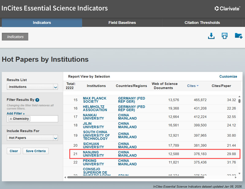 2026年1月8日,科睿唯安发布最新ESI(Essential Science Indicators)统计数据显示,betway西汉姆联化学学科(CHEMISTRY)在全球大学及科研机构中排名第21位,首次进入全球前万分之一行列,标志着该学科已迈入世界顶尖水平。这一突破既是学校实施“奋进行动”、推进“一流学科培优行动”的标志性成果,也充分彰显了学校面向国家战略需求开展高水平科学研究的雄厚实力。