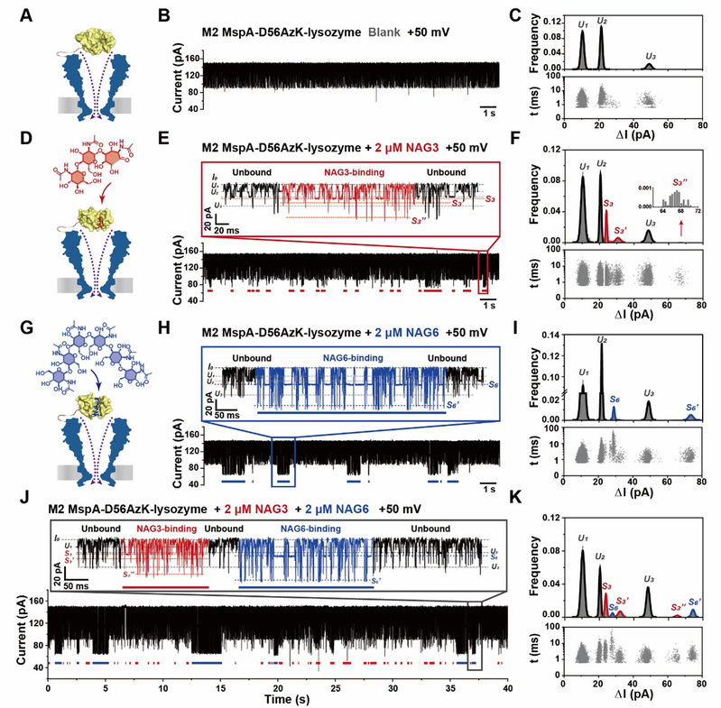 图2. 溶菌酶嵌合纳米孔与不同底物相互作用的单分子观测