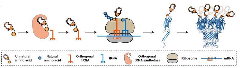 生物体可以通过20种天然氨基酸进行编码和执行生理功能,但仅限于这些氨基酸对于改造蛋白质的结构和扩展蛋白质功能是远远不够的。遗传密码扩展技术(GCE)是利用一对正交的氨酰tRNA合成酶/tRNACUA将非天然氨基酸(UAA)位点特异性的引入到蛋白质上,可用于原核、真核细胞、动物等体系中蛋白质生化功能的研究。此外,2022年的诺贝尔化学奖颁给了“点击化学和生物正交”,生物正交化学代表了一类高产的化学反应,在生物环境中能够快速且有选择性地进行,成为了生物分子可视化和分析强有力的工具。一些含有生物正交反应基团的非天然氨基酸的出现,极大地拓展了其应用场景。