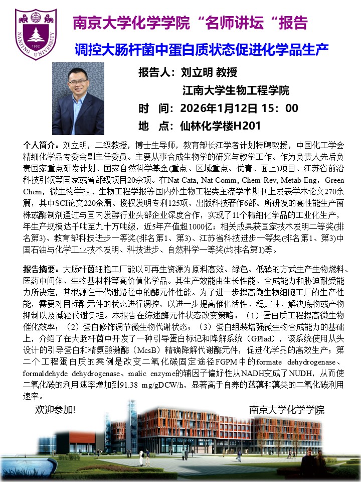 1月12日名师讲坛-刘立明教授:调控大肠杆菌中蛋白质状态促进化学品生产