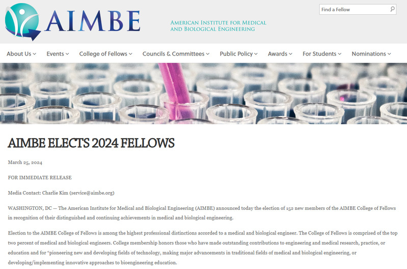 美国医学与生物工程院(AIMBE)是国际医学与生物工程领域著名的非营利学术组织,旨在为医学和生物工程领域的发展提供支持和帮助,以推动社会发展。AIMBE现有2000余位会士,由世界医学与生物工程领域最杰出(Top 2%)的学者组成,代表了最具创新和特色的医学与生物工程领域的学者和工程师。AIMBE会士每年经过国际同行提名与严格评选产生,是美国医学和生物工程技术领域的最高学术荣誉。