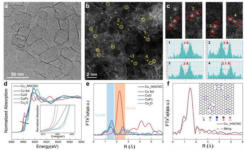 图 1. Cu-1/hNCNC的形貌和结构表征。(a) TEM图像。(b,c)HAADF-STEM图像, Cu双原子(圈出)和Cu单原子(b)以及位置1-4的相应放大和强度分布(c)。(d) Cu-1/hNCNC的Cu K边XANES光谱及其参照。(e) Cu-1/hNCNC的FT-EXAFS光谱及其参照。(f) Cu-1/hNCNC在R空间中Cu K边的FT-EXAFS拟合曲线及其相应的结构图。