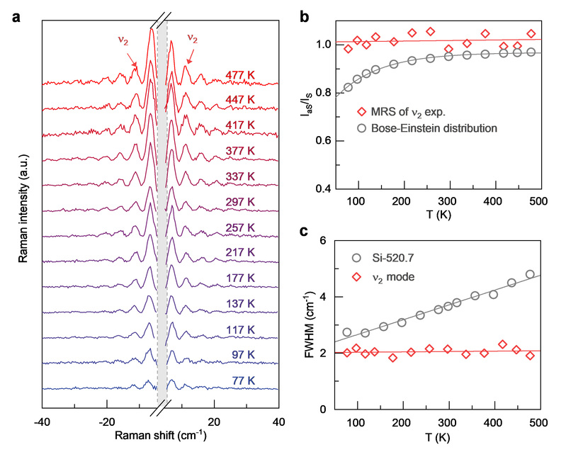 在光学拉曼光谱中,粒子振动态布居数决定了anti-Stokes和Stokes信号的强度比(IaS/IS),并遵从玻色-爱因斯坦分布。相比于光学拉曼过程,MRS具有显著的无热噪声特征,这表现在:(1)IaS/IS值在整个实验温度区间(77-477 K)始终接近常数1;(2)半峰宽不随温度升高而展宽。这一特点使MRS在振动测量具有独特优势(图3)。研究团队还通过一系列复合振子实验验证了MRS的长程传播行为和隐藏界面探测能力。