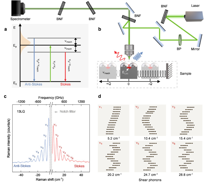 纳米尺度界面的力学相互作用携带了原子级界面结构、热传导和光电特性等关键信息,但因其电子-声子耦合效应非常有限,人们无法通过经典振动光谱学方法对其进行直接测量。以层状石墨晶体中的超低频剪切声子为例,具有原子层集体性同向运动的声子振动模式蕴含了晶体全局结构和隐藏界面的独特信息,但由于相邻层间的极化率改变量相互抵消而无法产生可探测的电偶极子辐射。如何有效地获取这一类信息,并将其应用于晶体全局结构表征、表界面相互作用和微观机械振子的测量,当前光谱学领域尚未有较好的解决办法。