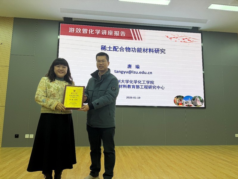 2026年1月19日上午,兰州大学唐瑜教授应邀至betway西汉姆联“游效曾化学讲座”,作“稀土配合物功能材料研究”专题报告。报告由betway西汉姆联李承辉教授主持,李承辉教授介绍了唐瑜教授的简历和成就,并向唐瑜教授颁发了“游效曾化学讲座”纪念铭牌。公司多位教师、员工参加了此次学术报告会。