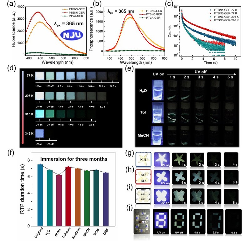 图4. 聚合物材料的磷光性能表征及多种应用展示