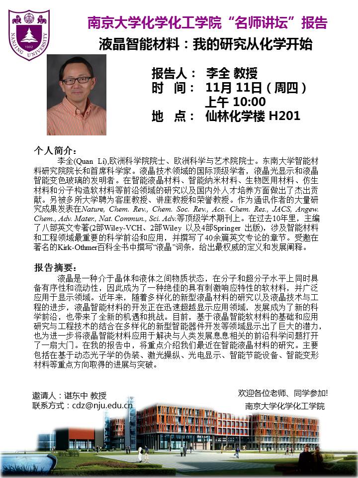 11月11日名师讲坛-李全教授:液晶智能材料:我的研究从化学开始