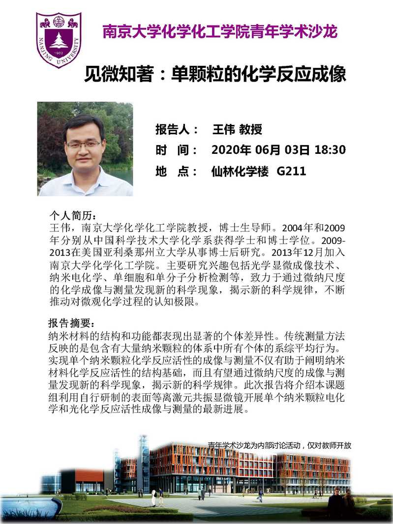 2020年6月3日 | 王伟 | 见微知著:单颗粒的化学反应成像 | 18:30 | G211 |