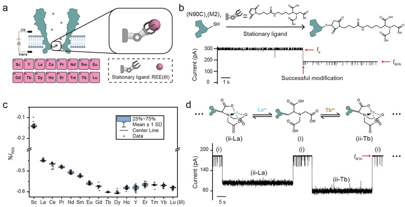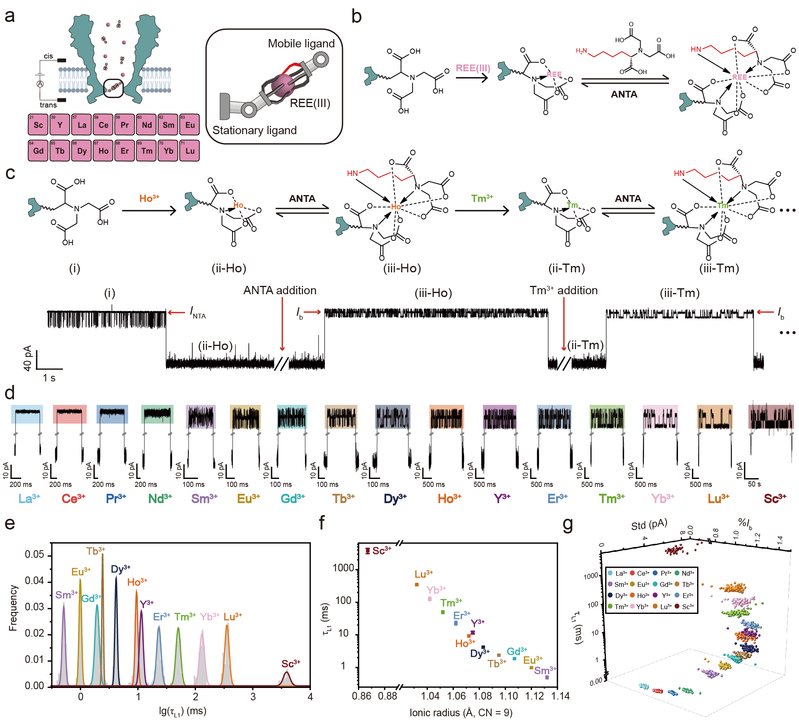 为了进一步提高对稀土的区分能力,该团队在单配体策略的基础上引入第二个游离的配体,创新性地提出双配体策略(图2)。当孔道上的固定配体(NTA)螯合三价稀土离子时,此时稀土离子还有多余的空轨道可以与游离配体(N,N-双 (羧甲基)-L-赖氨酸,ANTA)发生配位作用,从而汇报出专属于该稀土离子的特异性事件,机器学习识别准确率高达99.6%,这是世界上第一个能完全分辨所有稀土的纳米孔。同时,该团队也通过稀土离子的特异性事件在单分子水平上观测到镧系收缩规律。