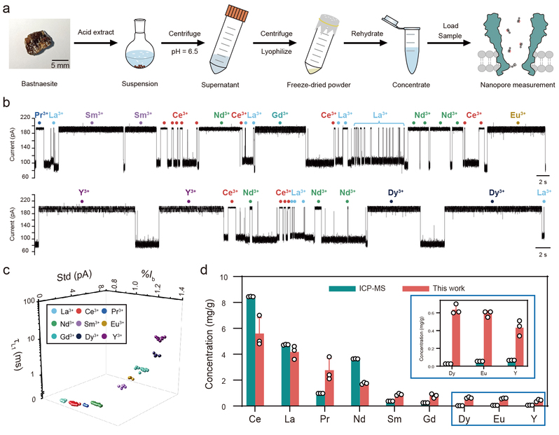 随后该团队将双配体策略应用到真实稀土矿石—氟碳铈矿的分析中(图3),通过酸解冻干提取氟碳铈矿中的稀土,并利用纳米孔进行鉴定和定量分析,成功鉴定出氟碳铈矿中的稀土种类和丰度,且纳米孔检测结果与ICP-MS结果相一致。这一结果体现了该方法的实用性,展示其在矿石勘探领域的应用潜力。