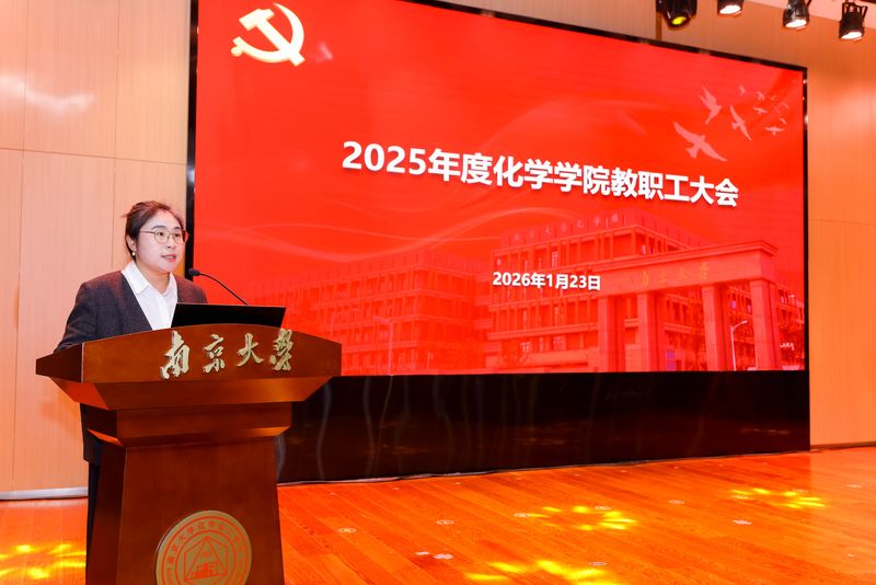 经理黎书华代表学院行政班子作工作报告,全面展示了学院在团队建设、队伍建设、平台建设和科学研究、人才培养、学术交流、支撑条件建设和社会服务重点等方面取得的亮眼成绩:化学学科 ESI 排名首次进入全球前万分之一;队伍建设成效显著,国家级人才占比达 51%;科研平台持续升级,科研经费到账 2.7 亿元位列全校第一,斩获多项国家级、省部级科研奖项;教学与人才培养质量稳步提升,课程教材建设成果丰硕,员工在各类竞赛中屡获佳绩;学术交流氛围浓厚,成功举办多场高水平学术活动;支撑条件不断优化,实验室安全管理规范高效,校地、校企合作深入推进。黎经理还逐一介绍了 2025 年度新入职及新调入教职工,欢迎他们加入学院大家庭,期待他们与全院同仁共同奋进。最后,黎经理对2026年学院在学科发展、人才队伍建设、推进化工学院建设等方面的工作进行了部署。
