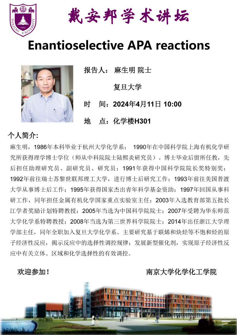 4月11日戴安邦学术讲坛-麻生明院士:Enantioselective APA reactions