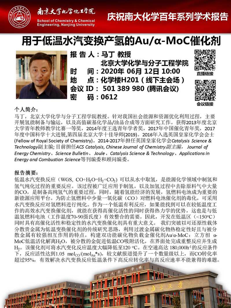 6月12日庆祝南大化学百年系列学术报告-马丁教授:用于低温水汽变换产氢的Au/α-MoC催化剂