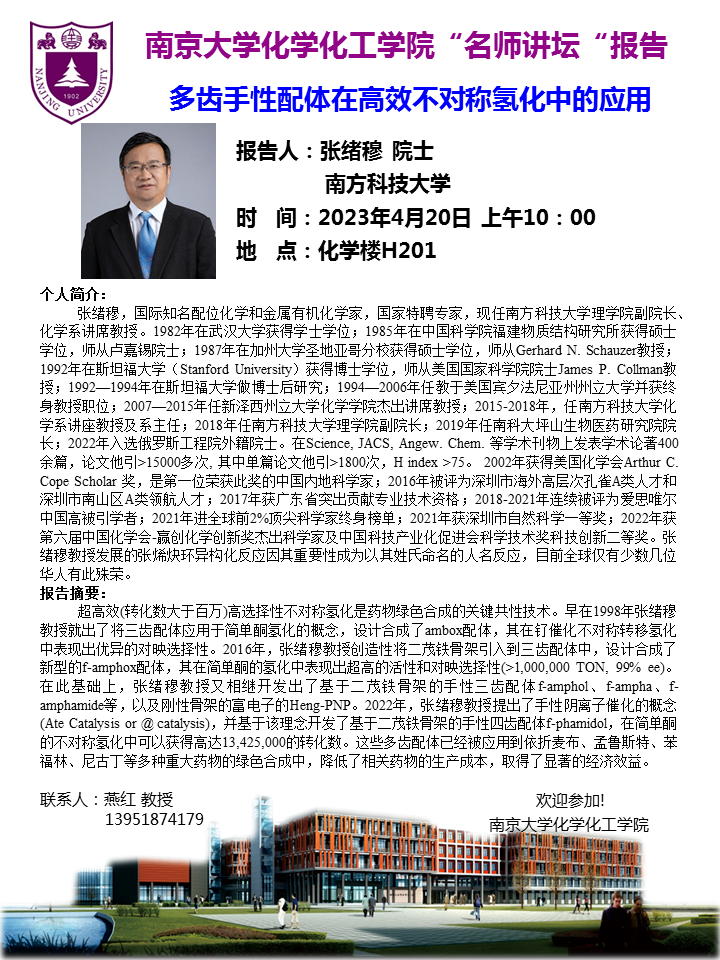 4月20日名师讲坛-张绪穆院士:多齿手性配体在高效不对称氢化中的应用