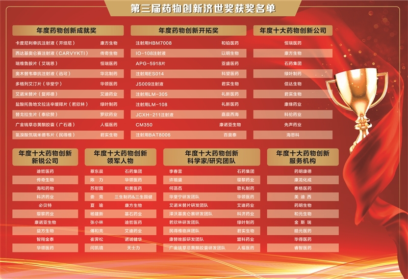 本届药物创新济世奖评选共设立2个药物奖、2个公司奖、2个人物奖和1个服务机构奖。评选专家委员会根据“人民金融·创新药指数”数据库、药物评价等材料,共评选出恒瑞医药、康方生物、石药集团等“年度十大药物创新公司”,迪哲医药、传奇生物等“年度十大药物创新新锐公司”,卡度尼利单抗注射液、西达基奥仑赛注射液等“年度药物创新成就奖”10个,注射用HBM7008、IO-108注射液等“年度药物创新开拓奖”10个,蔡东晨、陈力等“年度十大药物创新领军人物”,李春雷、许祖盛等“年度十大药物创新科学家/研究团队”,以及药明康德、康龙化成等“年度十大药物创新服务机构”。